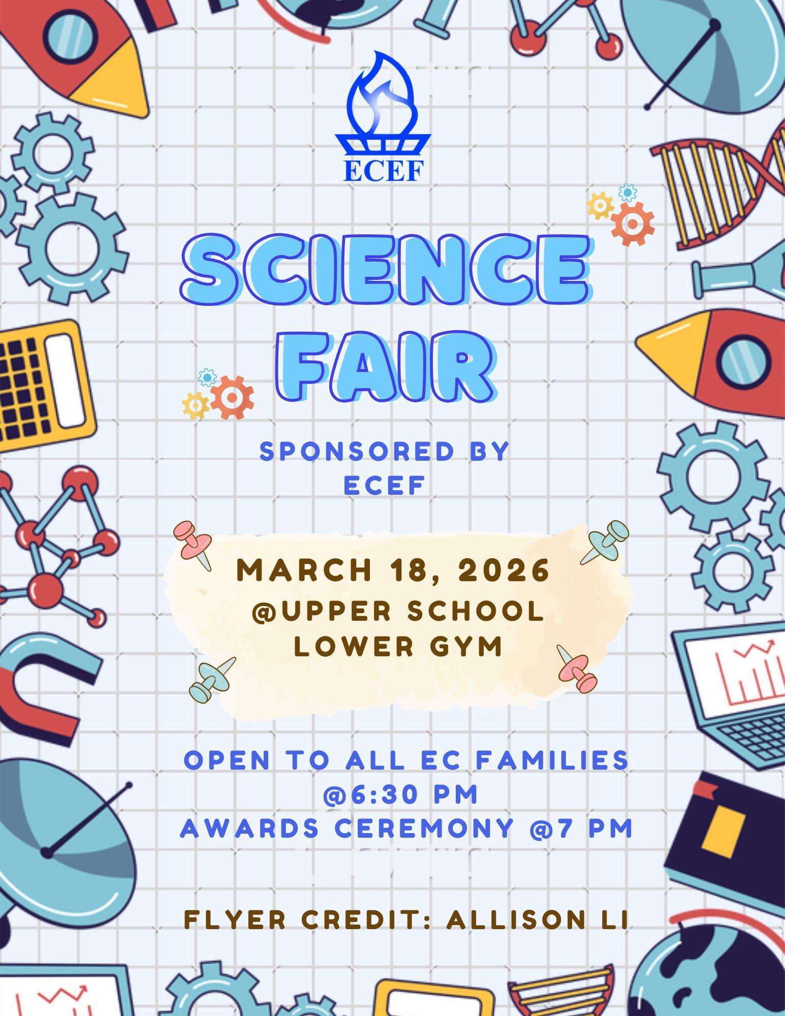 Science Fair Sponsored by ECEF March 18, 2026 @Upper School Lower Gym Open to All EC Families @ 6:30pm Awards Ceremony @ 7pm